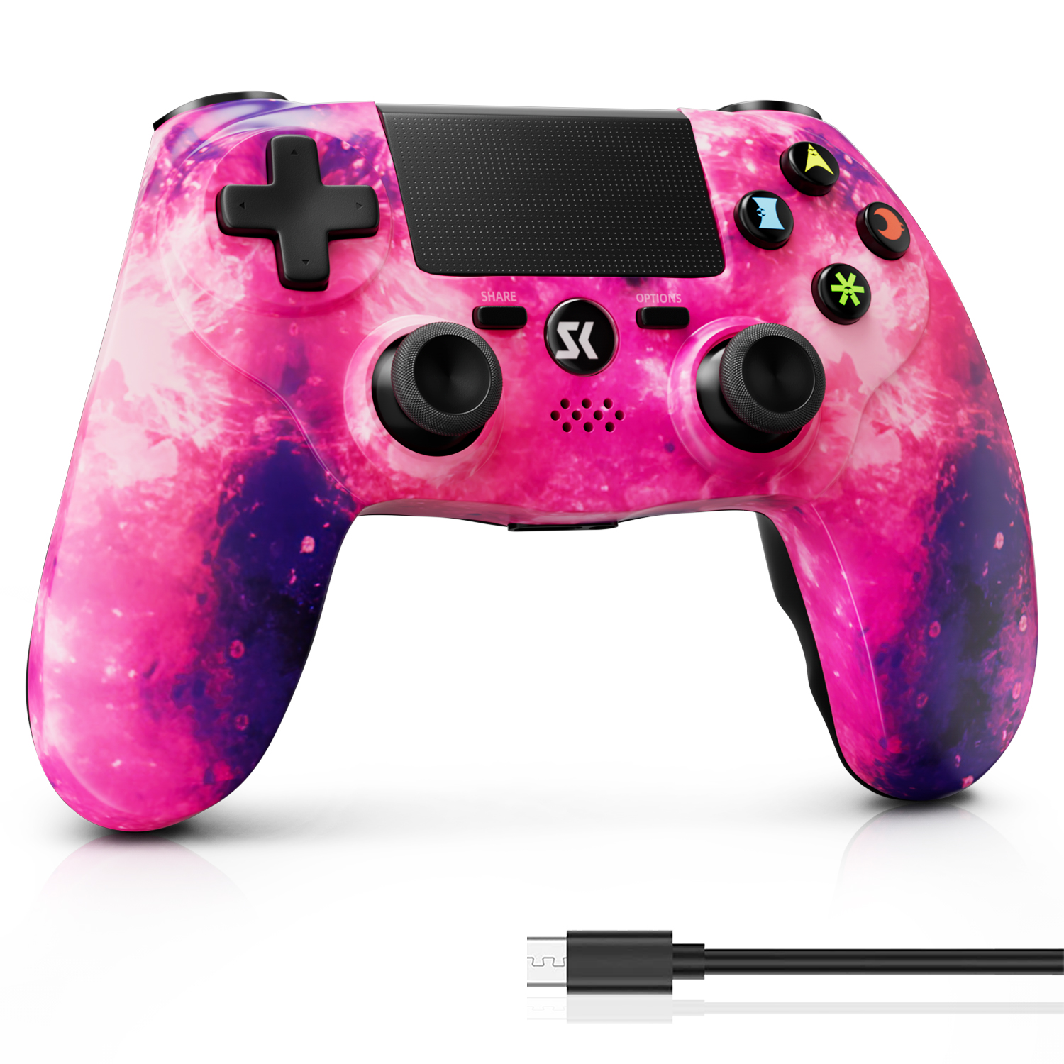 The ISHAKO Wireless Controller offers smooth compatibility with PS4, PS4 Pro, PS4 Slim, and Windows PC/laptop systems. For first-time connection to a PS4 console, simply use the included USB cable for pairing. This controller features a built-in 800mAh rechargeable battery that supports both USB-C charging and desktop chargers, providing reliable, long-lasting playtime. With dual vibration motors and six-axis motion control, it enhances your gaming experience with responsive and immersive feedback. Designed with ergonomics in mind, it offers a comfortable grip with non-slip texture on the back for better control during long sessions. The 360° joystick is highly sensitive and drift-free, allowing for smooth and precise movements. Additional enhanced features include LED indicators, a 3.5mm audio jack for headset support, and a responsive touchpad. With its unique cosmic nebula design, this controller not only performs well but also makes a great gift for gaming enthusiasts.